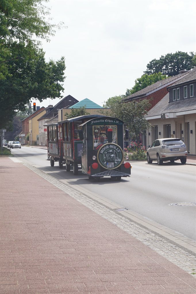 Die vollen Tüten musste jedoch niemand weiter zum Dorfplatz oder zu Raiffeisen tragen: Für die Marktbesucher:innen kostenfrei ging es mit der Moor-Molly auf Spritztour durch das Dorf. Der Verein Findorffs Erben e. V. stellte diesen Shuttle-Dienst bereit.