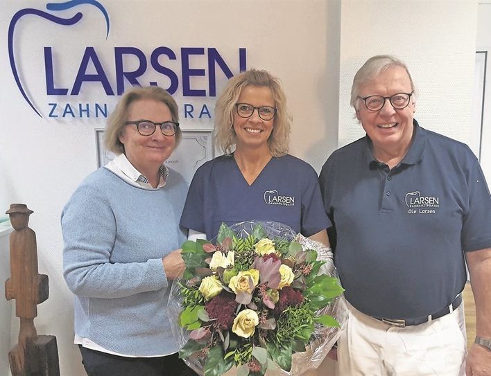 Bremervörde (eb). Bärbel Otto feierte am 1. November ihr 30-jähriges Dienstjubiläum in der Zahnarztpraxis Larsen. Seit 1988 ist Bärbel Otto in der Praxis tätig. 1985 begann Bärbel Otto ihre Lehre zur Zahnarzthelferin in Bremervörde, die sie erfolgreich 1988 abschloss. Nach einer kurzen Zeit in Bremen wechselte sie wieder nach Bremervörde in die Praxis von Ingrid und Ole Larsen. Neben den zahlreichen Fortbildungen stand die Spezialisierung im Bereich Prophylaxe im Vordergrund. Die Veränderungen im Gesundheitswesen und innerhalb der Praxis ist sie stets mitgegangen. Gab es im Jahr 2001 noch eine Fortbildungsreihe zum Thema Prophylaxe an der sie teilnahm, wurde daraus im Jahr 2011 eine Ausbildung. Diese berufsbegleitende Aufstiegsfortbildung zur zahnmedizinischen Prophylaxeassistentin (ZMP) schloss sie ebenfalls erfolgreich ab. Weitere Meilensteine waren die ersten Schritte bei der digitalen Materialwirtschaft. Seit Jahren ist sie nun Spezialistin im Bereich Prophylaxe für Erwachsene sowie Vorbehandlung von Parodontose-Patienten. In einer kleinen Feierstunde bedankten sich Ingrid und Ole Larsen bei Bärbel Otto für ihre langjährige Treue und Arbeit.