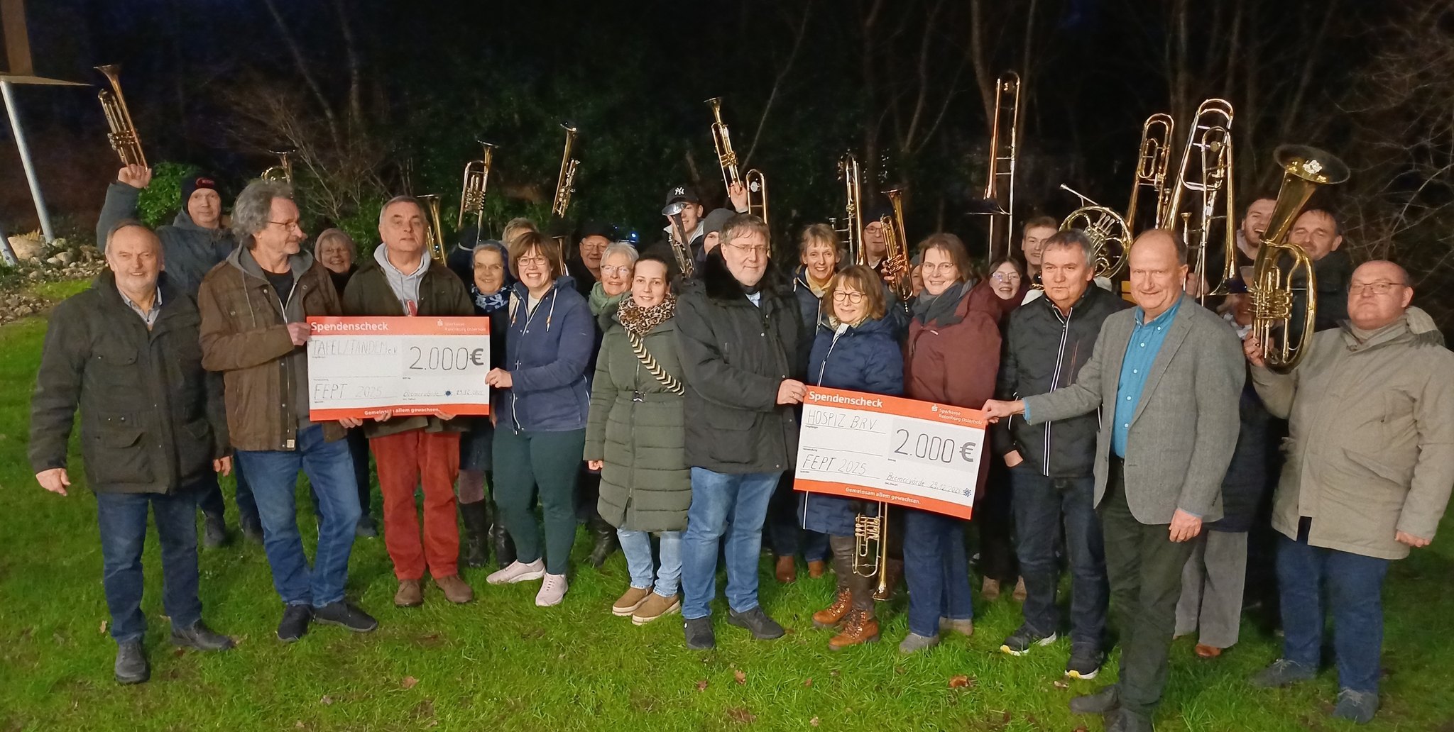 Beim Posaunentag wurde eine Kollekte gesammelt, die vom Posaunenchor Farven und den Farvener Vereinen aufgestockt wurde. So kamen am Ende insgesamt 4.000 Euro zusammen. Dieser Betrag wurde Ende Dezember von den Pastoren Burkhard Kurz von der Pella-Gemeinde Farven und Manfred Thoden von der St. Lamberti-Gemeinde Selsingen je zur Hälfte an den Vertreter des Hspiz, Pastor Volker Rosenfeld, und der Tafel, Andreas von Glahn, übergeben. Der Hauptorganisator Bernhard Poppe würdigte die wertvolle Arbeiten des Hospiz und der Tafel. Der Posaunenchor Farven umrahmte die kleiner Feierstunde musikalisch.