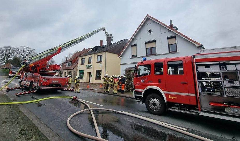 Inzwischen hatte auch die Polizei die Baustraße zwischen Ecke Bahnhofstraße und kurz vor der Einmündung Am Kirchenplatz abgeriegelt. Der Wohnungsbrand im ersten Stock des Gebäudes griff auf das Dachgeschoss über, sodass weitere Atemschutzgeräteträger angefordert werden mussten. Da erfahrungsgemäß tagsüber nicht so viele freiwillige Einsatzkräfte mit dieser Qualifikation zur Verfügung stehen, wurden die Ortswehren Sandhaussen und Freißenbüttel nachalarmiert, sodass etwa 70 Einsatzkräfte vor Ort waren.