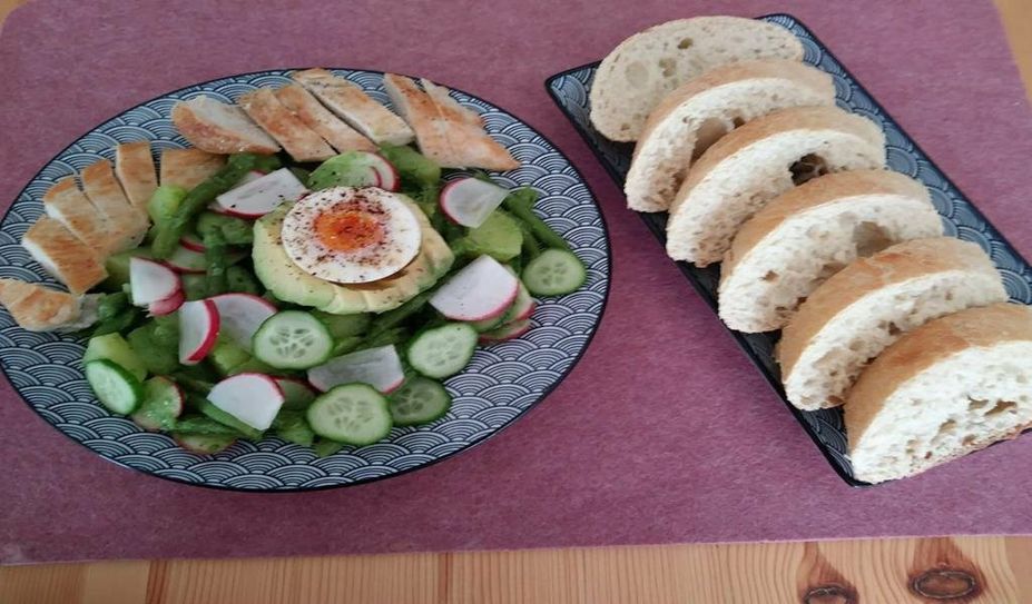 Es sind wieder einfache Zutaten, nichts dabei, wonach Sie lange suchen müssen. Das Rezept ist für 4 Personen. Die Zutaten: 800 g kleine Kartoffeln (Drillinge), 2 Eier, 4 kleine Hähnchenfilets, 4 EL Öl, Salz, Pfeffer, Pfeffer aus der Mühle, 250 g grüne Bohnen, 1 schönes Bund Radieschen, das schreibe ich, weil das Grün der Radieschen genutzt wird, 2 Mini-Salatgurken, 5 Stiele Petersilie, Saft von einer Zitrone + 1 EL., 3 EL saure Sahne oder Naturjoghurt, Zucker, 2 Avocados. Das ist die Zutat, mit der wir uns nicht anfreunden konnten. Fangen wir mal an. Kartoffeln als Pellkartoffeln kochen, pellen und halbieren. Eier wachsweich (7 Min.) kochen. Filets trocken tupfen und in 2 EL Öl ca. 10 Min. braten, aus der Pfanne nehmen, salzen und pfeffern. Bohnen putzen, in Salzwasser bissfest garen, abgießen, abschrecken, alles abkühlen lassen. Gurken und Radieschen waschen, putzen, Gurken nicht schälen, beides in dünne Scheiben schneiden. Petersilie und Radieschengrün waschen, Stiele entfernen, mit den Saft einer Zitrone, 2 EL Öl und saure Sahne pürieren. Mit Salz, Pfeffer und Zucker abschmecken. Das Dressing mit Kartoffeln und Gemüse mischen. Die Avocados halbieren, entkernen. Fruchtfleisch aus der Schale lösen, mit Rest Zitronensaft beträufeln. In Scheiben schneiden, aber als Hälften zusammenlassen. Filets schräg in Scheiben schneiden. Kartoffel-Bowl auf Teller anrichten. Filets, Avocadohälften und halbierte Eier auf Kartoffel-Bowl anrichten. Eierhälften mit buntem Pfeffer bestreuen. Dazu habe ich Ciabattabrot gebacken, das brauchten wir auch, um das leckere Dressing zum Schluss auf zunehmen. Guten Appetit.