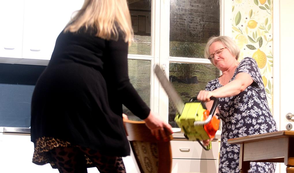 Kässy ist zwar ordentlich laut am Morgen und Anna ist von Haus aus eine ganz Scharfe, aber mit Tom Brettschneider (Jens Peper) passiert in Sachen Liebe nichts, sagt Fritz (Rainer Krentzel) über seinen Sohn zu seiner Frau Helga (Irmtraut Christgau). Dass Kässy Toms Kettensäge ist und er seine Lieblingsaxt Anna getauft hat, sorgt bei Vatter Fritz für „Koppkino, wenn de so snackt“. Einzig seine Sandkastenfreundin Klara (Stefanie Walendzik) versteht ihn und teilt seine Leidenschaft fürs Holzmachen mit Kässy und Anna. „Loot em“, findet Mutter Brettschneider zwar, aber Fritz ist will den Sohn doch mal aus dem Haus und unter die Haube bekommen. „Ick hebb ihn bi de Partnerschaftsbörse www Frau des Lebens Punkt de anmeldet“, sagt Fritz. „As Benjamin Blümchen.“ Mutter Helga schlägt die Hände vor die Augen: „Hast du an de Rüssel dacht?“, fragt sie entsetzt. So eindeutig zweideutig zieht sich die Partnersuche durch das gesamte Stück, sehr zur hellen Freude des Publikums, das ordentlich zu lachen hatte. Sie lachten über Postbotin Gerlinde (Kerstin Malnati) („domols hett de Post blots suupt, heute sünd se ok neijierig“), über die ganz offene Sandy (Merle Gerken), über die praktische Gina (Tatjana Wichels) und über die sportliche Svenja (Franziska Wendelken) und über all die Irrungen und Wirrungen zwischen den Geschlechtern. Sandy macht Fritz mehr Angst mit ihrer hungrigen Art, während die nächste Kandidatin Gina sofort bei Vater Fritz punktet, weil sie über seine Dad-Jokes lacht. Svenja will Fritz als ihren vermeintlichen neuen Partner erstmal testen, wie lange der einen Dauerlauf aushält – dem ist weder Fritz‘ Ischias noch seine gesamte Konstitution gewachsen. Fritz, laut Postbotin „in dat gefährliche Öller“, macht sich „to’n Kasper“ und bringt seine Frau nicht nur zum Weinen, sondern auch an die Kettensäge und die 120 Gäste im Saal zum Lachen.