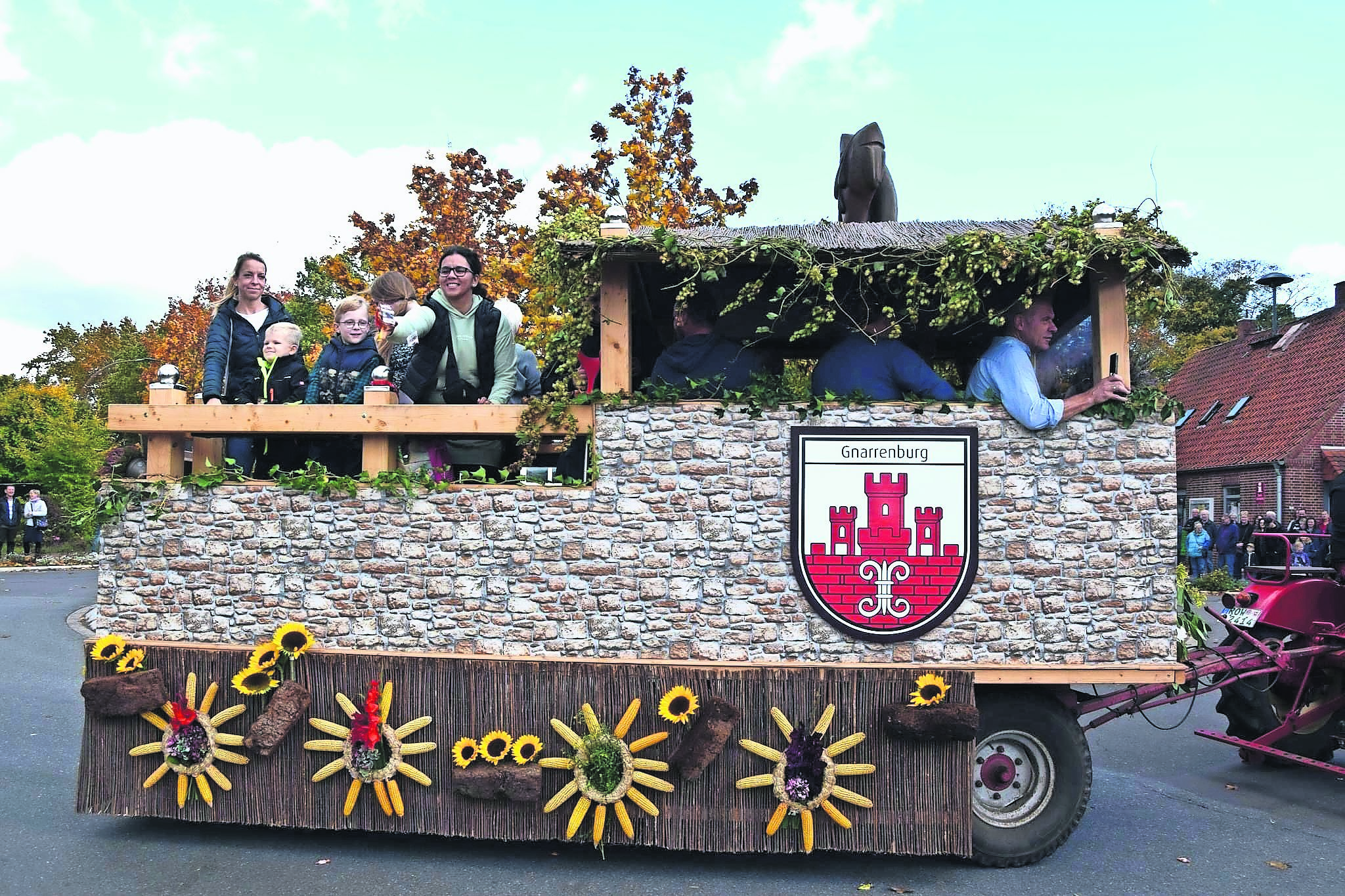 Den krönenden Abschluss des Gnarrenburger Herbstmarktes macht am Sonntag, 19. Oktober, traditionell das Erntefest mit Ernteumzug. Der Umzug startet um 12.30 Uhr an der Feuerwehrwiese in der Waldstraße und führt durch Gnarrenburg. Dann werden die bunt geschmückten Erntewagen mit toller Stimmung durch die Gemeinde ziehen. Die Prämierung der schönsten Erntewagen und Kinder-Erntewagen findet voraussichtlich um 16 Uhr im Festzelt statt. Es warten tolle Preise auf die Teilnehmenden. Nach der Prämierung kann mit DJ Mallorca Uwe noch einmal ordentlich gefeiert werden.