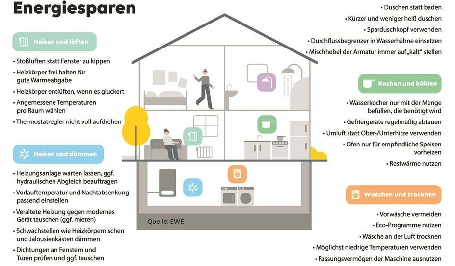 Die Diskussion um Energiepreise und auch um die Versorgungssicherheit bestimmen seit Wochen die Nachrichten. Strom, Gas und Heizöl sind teuer wie lange nicht, ein Ende der Preisentwicklung ist nicht in Sicht. Energiesparen wird daher immer wichtiger. Das Thema ist nicht nur gut fürs Portemonnaie, sondern auch fürs Klima. Der Energiedienstleister EWE gibt seiner Kundschaft daher schon seit vielen Jahren Tipps zum sparsamen Umgang mit Energie. Aktuell unterstützt das Unternehmen auch den Aufruf des Bundeswirtschaftsministers an die Verbraucher:innen - von der Wirtschaft bis zu Privathaushalten - im Vorgriff auf etwaige Mangellagen in der kommenden Heizperiode den Verbrauch schon jetzt so gut wie möglich zu reduzieren. Denn: Was in diesem Sommer nicht verbraucht wird, kann bereits vorsorglich für den kommenden Winter im Speicher verbleiben. 14 Prozent des Energieverbrauchs entfallen in Haushalten beispielsweise auf das Warmwasser. Kürzer und weniger heiß zu duschen, Wasser sparende Duschköpfe einsetzen oder das Wasser zwischendurch abzustellen kann somit den Energieverbrauch senken. Auch Stromsparen hilft, weil dieser auch aus Gaskraftwerken stammt. Diese simplen Tipps helfen, um in den eigenen vier Wänden Energie einzusparen.