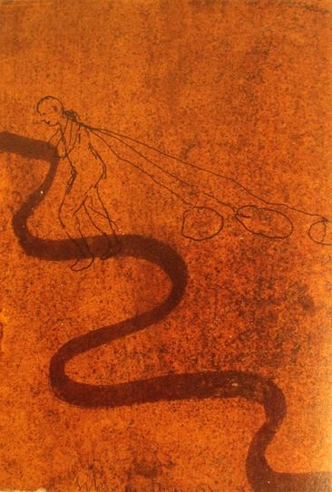Darauf deutet z. B. der Unterschied zwischen Schwontkowskis Maltechnik des Hintergrundes und der Kritzel-oder Hinwischtechnik der vordergründigen, so einsamen wie nicht individuierten Figuren. Immer wieder dick aufgetragene Schichten von Farbe, Eisenoxide und Zahnpasta machen den Hintergrund zu einem in sich festgeschlossenen, dunklen oder braun-okkrigen gegenstandslosen Dunst mit endloser Tiefe. Die Figur hingegen ist nachträglich und nur konturhaft reingekritzelt, wirkt dadurch abgetrennt und schleppt sich, wie in Ohne Titel, 1993, Steine hinter sich herziehend durch die gegenstandslose Umgebung. Mit gesenktem Kopf. Vorausschauen braucht die Figur nicht - überall ist es gleich.