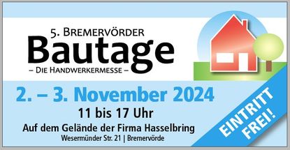 Bremervörde. Am Samstag, 2. November, und Sonntag, 3. November, 2024, finden die 5. Bremervörder Bautage auf dem Gelände der Firma Hasselbring und Lange und Sohn in der Wesermünder Straße 21 von 11 bis 17 Uhr statt. Über 25 Handwerksbetriebe präsentieren sich und informieren Haus- und Grundeigentümer über Neu- und Umbau, Sanierung sowie moderne Baupraktiken. Die Veranstaltung wurde von Dietmar Thobaben und Wilfried Schmädjens initiiert und bietet eine Plattform für Fachgespräche und Austausch. Ein besonderes Highlight ist das Thema „Heizen mit Holz“, präsentiert von regionalen Anbietern. Die Veranstalter hoffen auf zahlreiche Besucher und interaktive Gespräche. Kinder können sich auf eine Hüpfburg freuen.