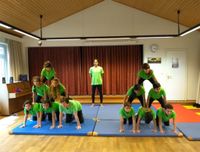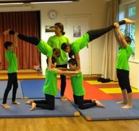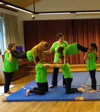 Der „Turm“ ist eine Kreisfigut, in der die gesamte Gruppe eingebunden ist. Das „Doppeltor“ wird mit sechs Kindern aufgebaut. Bei allen Figuren ist nicht Körperkraft die ausschlaggebende kompetenz, sondern Balance, Einfühlungsvermögen und vor allem Körperspannung. Viel Mut und Vertrauen in die Gruppe hatten die Schwestern Lemar und Nour, sie ließen sich hoch oben von den Schultern des Lehrers wie ein Baumstamm von der tragenden Armreihe der Gruppe auffangen. Eltern und Freunde spendeten begeisterten Applaus. Die Kinder können stolz auf ihren Erfolg sein.