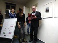 Danach übernahm Uwe Matthias das Wort. Er gestand Siegel, dass sie eine echte Herausforderung gemeistert und Bremervörde durch ihre Bilder gut eingefangen habe. Schmunzelnd verkündete er, man könne ihre Kunstwerke bei den nächsten Sanierungsarbeiten zurate ziehen und er bezog sich dabei vor allem auf den roten Klinker, den Siegel in mehreren ihrer Werke zeigte.