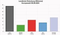 Im Landkreis Rotenburg (Wümme) haben von 132.480 Wahlberechtigten 86.919 ihre Stimme abgegeben, was einer Wahlbeteiligung von 65,61 Prozent entspricht. 2019 lag die Wahlbeteiligung bei 62,2 Prozent. Stärkste Kraft wurde mit 38,30 Prozent die CDU, gefolgt von der SPD mit 17,33 Prozent. Die AfD legte deutlich zu auf 13,38 Prozent, vor fünf Jahren kam die Partei auf 7,3 Prozent. Und während die Grünen vor fünf Jahren noch auf 21,5 Prozent kamen, erhielten sie jetzt nur noch 9,82 Prozent und gehören damit zu den größten Verlierern. Die FDP erhielt 5,07 Prozent, das neue BSW erreichte 3,87 Prozent. DIE LINKE 1,79 Prozent, Die PARTEI 1,58 Prozent, die Tierschutzpartei 1,29 Prozent, die PIRATEN 0,41 Prozent, FREIE WÄHLER 1,49 Prozent, FAMILIE 0,60 Prozent und Volt 1,80 Prozent.