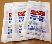 Mit der Aktion „Gewalt kommt nicht in die Tüte“ machen am 25. November der Landkreis und die Bäcker-Innung des Kreises Rotenburg (Wümme) auf das Thema häusliche Gewalt aufmerksam. Bei sieben Bäckereien im Landkreis bekommen die Kunden an diesem Tag eine ganz spezielle Tüte, auf der die Kontaktdaten von Frauenhaus und BISS abgedruckt sind. Insgesamt wurden 31.000 Tüten bedruckt.