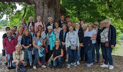 Am zweiten Tag brachte der Bus die Teilnehmenden nach Kassel an die Fulda bzw. zur Wilhelmshöhe. Die Zeit ließ es nicht zu, alles von der Wilhelmshöhe anzuschauen. Die Wilhelmshöhe ist eine Tagestour wert, mit dem Herkulesdenkmal, Löwenburg, Burgruine, Wasserspiele, engl. Garten usw. Sie gehört zum UNESCO Weltnaturerbe. Die Stadt Kassel streiften die Frauen nur kurz. Der Guide erklärte, Kassel ist 1943 bombardiert und zerstört worden, so ist sie eine junge Stadt und hat keine typische Altstadt. Die Landfrauen radelten los auf gut ausgebauten Radwegen, durch eine wunderschöne Landschaft in Richtung Hann. Münden. Viel Natur, aber auch hübsche kleine Orte, die zur Pause einluden bescherten den Teilnehmerinnen einen wunderschönen Tag. Ziel war der Weserstein. Der Weserstein markiert den Zusammenfluss von Fulda und Werra zur Weser auf der Flussinsel Tanzwerder. Seit 1899 steht der Stein am Ursprungsort der Weser. Nach der Ankunft war eine Stadtführung von Hann. Münden geplant. Hann. Münden wird auch Fachwerk- und Dreiflüssestadt genannt. Ein wunderschönes Rathaus, das Welfenschloss und über 700 alte Fachwerkhäuser aus sechs Jahrhunderten waren beim Rundgang zu bewundern. In der St. Blasius-Kirche, eine Hallenkirche, stimmten wieder einige sangesfreudige Landfrauen spontan das Lied: "Lobe den Herrn meine Seele" an. Mit vielen neuen Eindrücken ging der zweite Tag dem Ende zu und alle freuten sich auf Tag Drei.