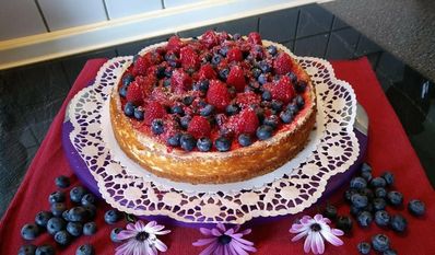 Ich grüße Sie, liebe Leserinnen und Leser. Was für ein Wetter. Das was ich trinke schwitze ich auch gleich wieder aus. Bei der Arbeit habe ich schon ein aufgerolltes Geschirrtuch im Nacken, sonst müsste ich mich des öfteren umziehen. Sommer ist ja schön, aber gleich so hohe Temperaturen. Ich hoffe, Sie trinken genug. Meinen Bewohnern schenke ich auch immer ein und mich vergesse ich dabei auch nicht. Ich habe einen „Amerikanischen Käsekuchen“ gebacken. Der Auftrag war etwas mit Heidelbeeren zu machen. Die Kombination mit Himbeeren finde ich toll. Ich glaube nicht, dass ich Sahne bei der Wärme steif bekommen hätte. Den Kuchen habe ich verschenkt und habe die Rückmeldung bekommen, dass er sehr lecker war.