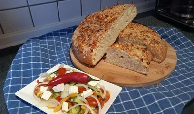 Die Zubereitung geht ganz fix. Mehl, Zucker, Salz und Hefe in einer großen Schüssel mischen. Wasser und Öl dazu geben und zu einem klebrigen Teig verkneten. Teig zugedeckt an einem warmen Ort gehen lassen, bis er sich verdoppelt hat. Ein Backblech wird mit Olivenöl bestrichen und etwas bemehlt. Den Fetakäse zerbröseln Sie grob. 2/3 von dem kneten Sie vorsichtig in den aufgegangenen Teig und formen ihn zu einem Laib. Den Laib auf das Backblech legen. Zuerst mit dem restlichen Fetakäse bestreuen, dann mit dem geriebenen Käse. Zuletzt etwas Oregano darüber geben. Ab in den Ofen für 40 Minuten. Sollte das Brot zu dunkel werden, einen Bogen Backpapier darüber legen. Nach dem Backen auf einem Kuchenrost lauwarm abkühlen lassen und mit dem Bauernsalat genießen. Das Gericht werde ich im Sommer bestimmt öfter machen, ist kein großer Zeitaufwand und es passt zum Grillabend.