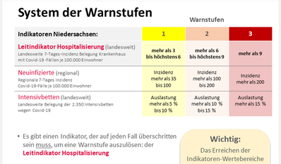 Die Warnstufen treten früher in Kraft, Warnstufe 1 bereits ab einer 7-Tages-Hospitalisierungsinzidenz von drei (vorher sechs), Warnstufe 2 bei einer Hospitalisierungsinzidenz von sechs und Warnstufe 3 dann bei neun. Auch vor der Warnstufe 1 treten erste Verschärfungen bereits ab einer 7-Tages-Neuinfektionsinzidenz von 35 ein, statt zuvor erst bei 50.
