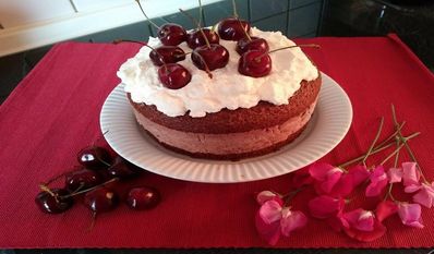 Wir fangen mit den Zutaten an. Für den Biskuit: 3 Eier, 75 g Zucker, 70 g Mehl Type 405, 1 EL Backkakao, 1/2 Tüte Backpulver. Für die Füllung: 200 g Zartbitterschokolade, 350 g Sahne, 3 Eier, 50 g Zucker, 150 g Amarena-Kirschen, 1 Handvoll frische Kirschen. Für den Biskuit, die Eier mit dem Zucker cremig aufschlagen. Mehl, Kakao und Backpulver mischen, über die Eimasse sieben und unterheben. Den Ofen auf 180°C - Umluft 160°C vorheizen. Eine 18er-Springform mit Backpapier auslegen (nur den Boden). Den Teig einfüllen, glatt streichen und 35 Min. backen. 10 Min. in der Form abkühlen lassen, Dann auf dem Kuchenrost auskühlen. Einmal quer durchschneiden. Für die Mousse, Schokolade hacken, schmelzen und warm abkühlen lassen. 200 g Sahne steif schlagen, Eier trennen. Eiweiße mit einer Prise Salz steif schlagen. Eigelbe mit 50 g Zucker cremig aufschlagen. Die Schokolade unterrühren, Eischnee und Sahne unterheben. Amarena-Kirschen gut abtropfen lassen. Einen Tortenring leicht einfetten. Den Rand mit Frischhaltefolie auskleiden. Tortenring um den unteren Kuchenboden stellen. Creme einfüllen, Amarena-Kirschen darauf verteilen, mit den 2. Boden belegen. Leicht andrücken und für 4 Stunden in den Gefrierschrank. Die Torte vor dem Servieren aus der Form lösen. 150 g Sahne steif schlagen und wolkig auf die Torte verteilen. Mit den frischen Kirschen garnieren. Ich finde, das ist ein schönes Dessert. Ein Espresso dazu und genießen.