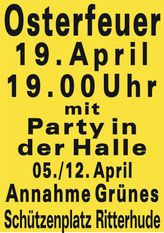 Den Ritterhuder Schützenverein wird es freuen, wenn man ihm wieder das Vertrauen schenkt und das Osterfeuer aus nah und fern besucht. Der Ritterhuder Schützenverein wird alles dafür tun, dass die Besucher ein paar unbeschwerte und gesellige Stunden in netter Gemeinschaft auf dem Schützenplatz verbringen können.
