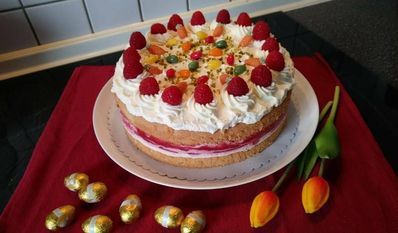 Starten wir mit den Zutaten: für den Biskuit: 5 Eier, 1 Prise Salz, 125g Zucker, 2 TL Backpulver, 150g Mehl. Für die Füllung: 10 Blatt weiße Gelatine, 500g frische Himbeeren, 210g Zucker, 300g Naturjoghurt (3,5%), 2 Tüten Vanillezucker, 550g Schlagsahne, Deko (kleine Eier, Möhren, gehackte Pistazien). Den Ofen heizen Sie auf 175°C vor. Eine 26-er Springform legen Sie mit Backpapier aus. Küchenmaschine ist startklar? Auf geht‘s. Die Eier werden getrennt. Eiweiße mit dem Salz steif schlagen, dabei 125g Zucker einrieseln lassen. Eigelbe einzeln unterrühren. Mehl und Backpulver mischen, auf die Eiercreme sieben und vorsichtig unterheben. Den Teig in die Springform geben, glatt streichen und 20-25 Min. backen. Lassen sie den Biskuit in der Form auskühlen. Den Formrand nicht einfetten, sonst kann der Teig nicht hochkrabbeln.