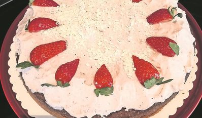 1/2 Pck. Backpulver, 1 EL Backkakao, 75g Erdbeerkonfitüre, 400g Schlagsahne, 2 Pck. Sahnefestiger, weiße Schokoröllchen oder Raspel zum verzieren.