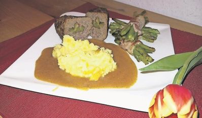 Die Zutaten: 1 Brötchen vom Vortag oder 3 Toast, 1 Ei, 2 Zwiebeln gewürfelt, Pfeffer, Salz, 500g gemischtes Hackfleisch, 4 Scheiben Schwarzwälder Schinken, 4 Gewürzgurken in Stifte geschnitten, 3 EL Rapsöl, 300ml Brühe, 100ml Sahne.