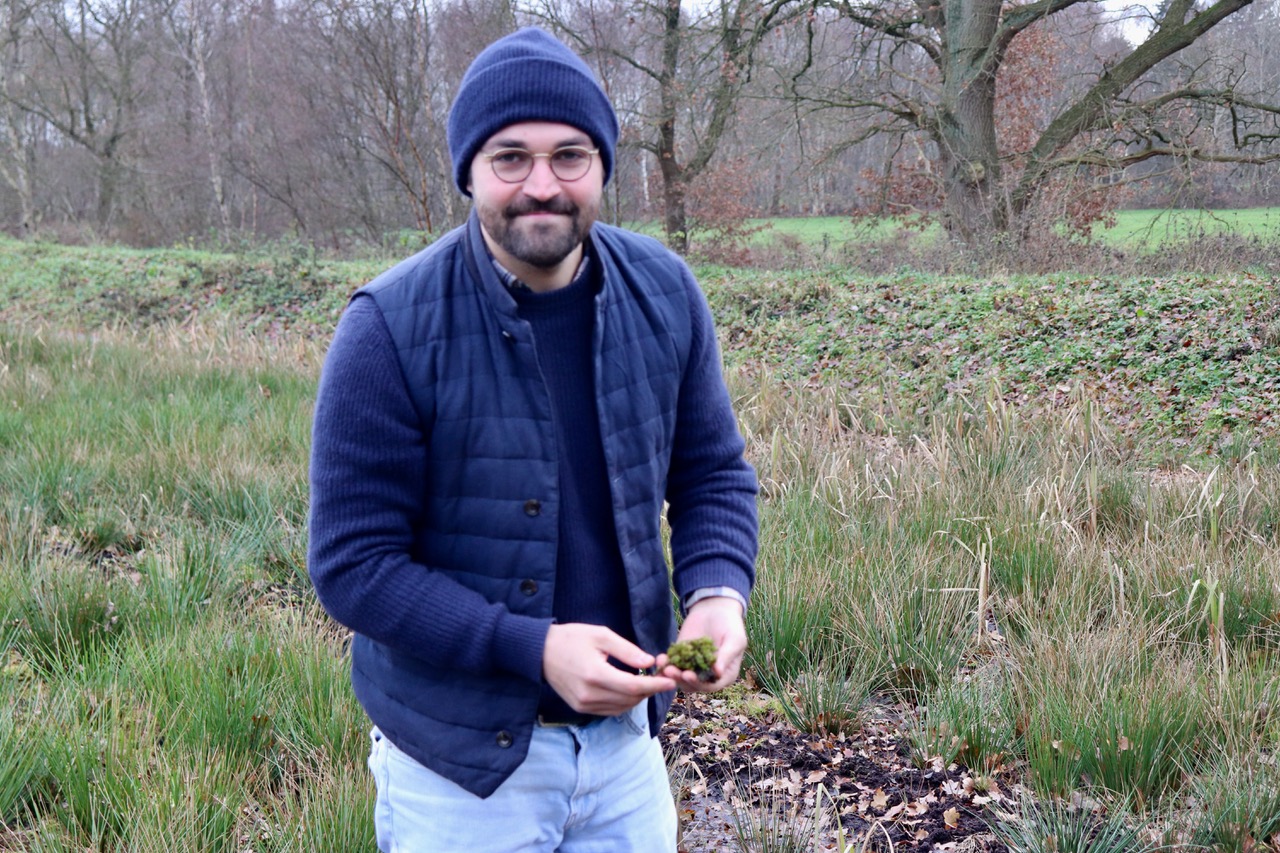 Paul Waldersee, einer der drei Geschäftsführer des Unternehmens, empfängt mich. Wir befinden uns auf einem Hof, den die Firma im Juli 2024 erworben hat – insgesamt eine Fläche von fast 20 Hektar. 13,4 Hektar haben die fleißigen Mitarbeiter bereits wiedervernässt. Dafür wurden Drainagen zerstört, Polder errichtet und ein Wassermanagementsystem installiert. Zuvor wurde das ehemals trockengelegte Areal als Intensivgrünland genutzt und mehrmals im Jahr gemäht. Davon ist heute nichts mehr zu sehen. Schnell wird klar, festes Schuhwerk, am besten wasserdicht, ist unabdingbar. Paul Waldersee springt beherzt über einen bis zum Rand gefüllten Wassergraben auf die Anbaufläche und präsentiert mir stolz den ersten Flaum des neu angebauten Torfmooses. Waldersee kommt aus Schleswig-Holstein, ist in Hamburg aufgewachsen und hat Landwirtschaft studiert.